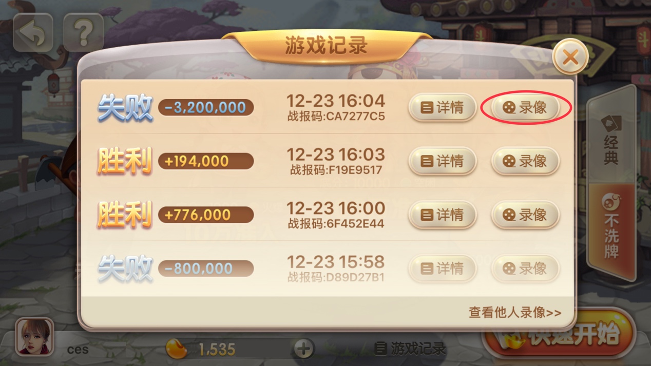 进入一言棋牌分类,点击《斗地主》,进入“经典玩法”或“不洗牌”时,都会在右下角看见“游戏记录”图标,点开除了能看到每局的战绩,还可以查看每局的录像进行回顾。