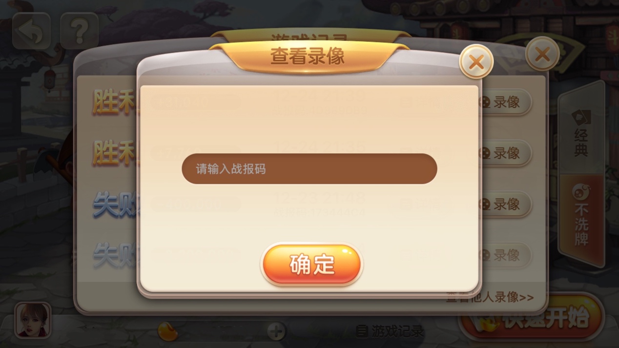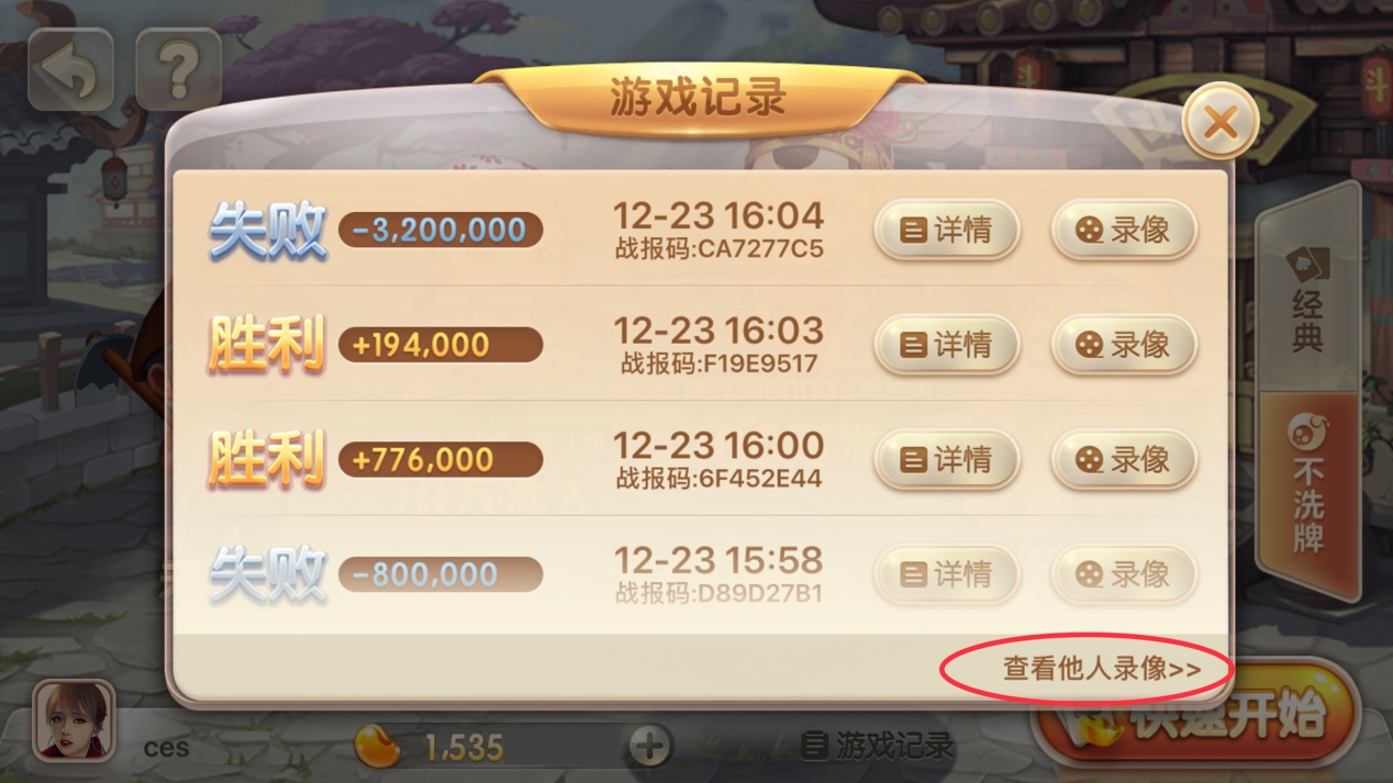 进入一言棋牌分类,点击《斗地主》,进入“经典玩法”或“不洗牌”,点击右下角的“游戏记录详情“——点击弹窗右下角文字链接“查看他人录像”——输入战报码,就可以查看他人的游戏录像了。无论你想向大神学习,还是回顾每一局对战,都可以通过上述方法找到录像。
