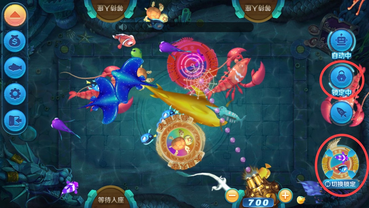 单击“锁定”按钮,就会自动锁定炮台正前方倍数最高的鱼。同时在屏幕右下角会看到当前锁定的目标。